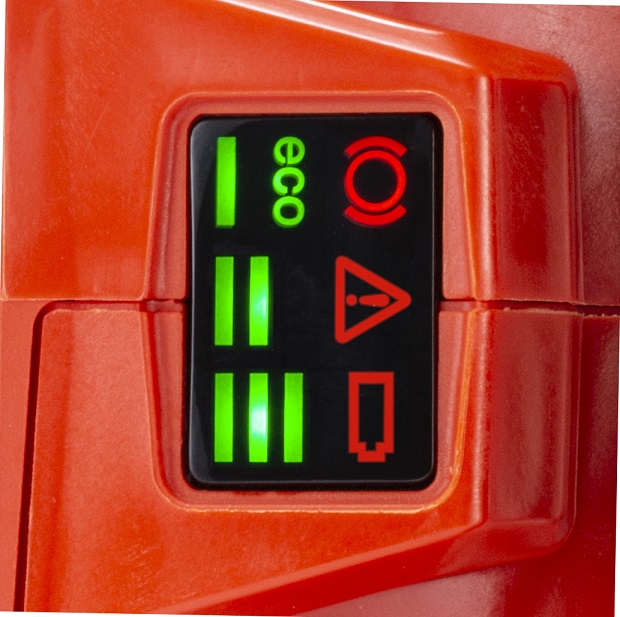 - Indikace vybití akumulátoru, přetížení/přehřátí stroje, spuštění řetězové brzdy nebo zvolené rychlosti