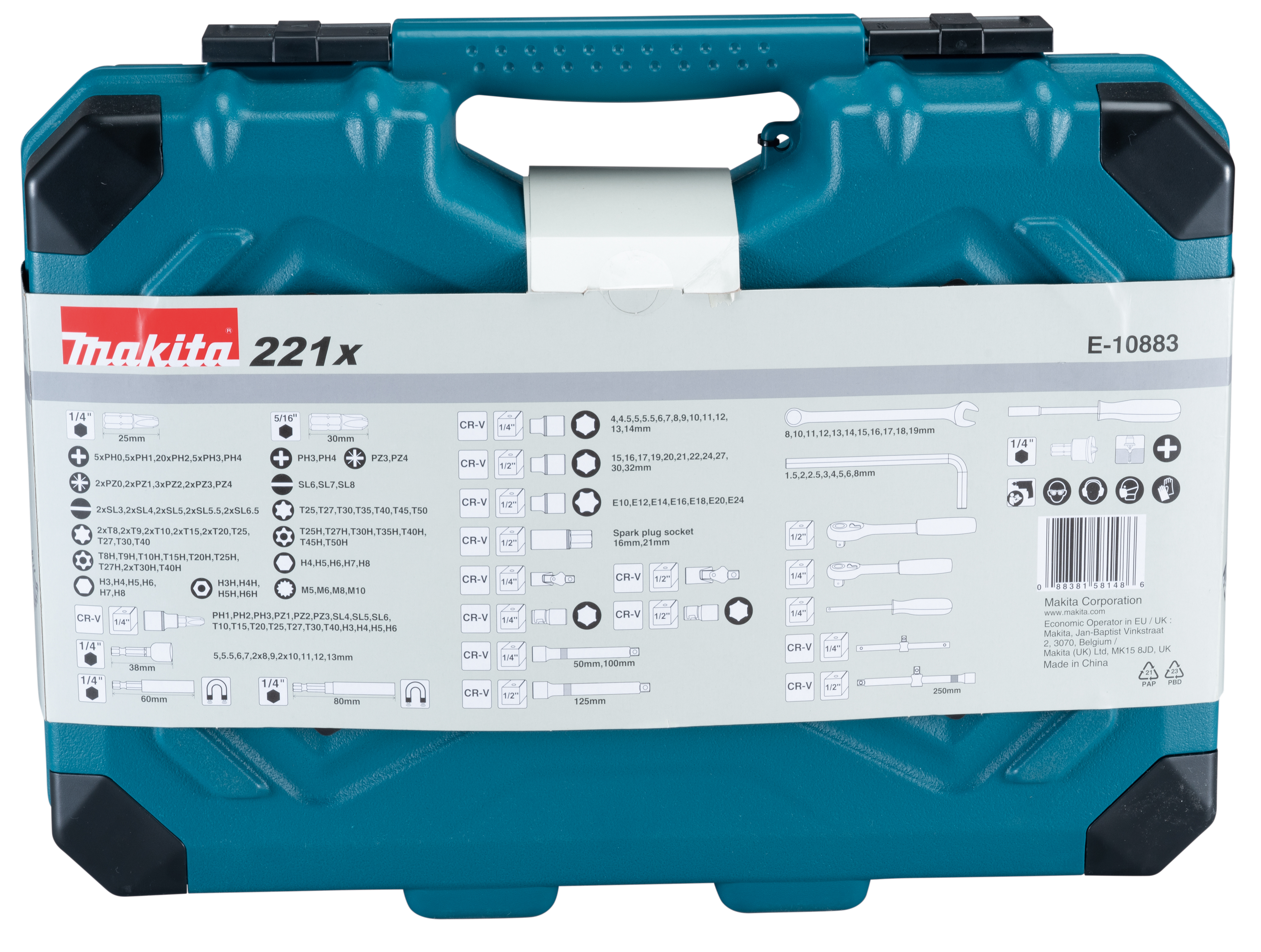 Sada obsahuje: 11x kombinovaný klíč 8-19 mm, 1x sada imbusového klíče 1.5, 2, 2.5, 3, 4, 5, 6, 8 mm, 90x bity 25 mm, 5x PH0, 5x PH1, 20x PH2, 5x PH3, 1x PH4, 2x PZ0, 2x PZ1, 3x PZ2, 2x PZ3, 1x PZ4, 2x SL3, 2x SL4, 2x SL5, 2x SL5.5, 2x SL6.5, 1x H3, 1x H4, 1x H5, 1x H6, 1x H7, 1x H8, 1x HH3, 1x HH4, 1x HH5, 1x HH6, 2x T8, 2x T9, 2x T10, 2x T15, 2x T20, 1x T25, 1x T27, 1x T30, 1x T40, 1x TH8, 1x TH9, 1xTH10, 1x TH15, TH2, TH3, 1x TH15, 1x TH2, 1x TH12, 1x TH12 1 x TH40, 1x držák bitů 60 mm magnetický, 1x vodicí pouzdro šroubu 80 mm magnetické, 1x bit na sádrokarton PH2 25 mm, 1x adaptér 1/4" čtverec na 1/4" šestihran 25 mm 1/4", 1x adaptér 1/4" čtverec na 1/4" šestihran 30 mm 5/16", 12x nástrčný klíč vložky 1/4" šestihran 5, 5.5, 6, 7, 2x 8, 9, 2x 10, 11, 12, 13 mm, 30x bity 30 mm 5/16":, 1x PH3, 1x PH4, 1x PZ3, 1x PZ4, 1x T25, 1x T27, 1x T30, 1x T35, 1x T40, 1x T45, 1x T50, 1x TH25, 1x TH27, 1x TH30, 1xTH35, 1x TH40, 1x TH45, 1x TH50, 1x H4, 1x H5, 1x H6, 1x H7, 1x H8, 1x SL6, 1x SL7, 1x SL8, 1x M5, 1x M6, 1x M8, 1x M10, 2x ráčna 1/2" a 1/4", 1x T-rukojeť 1/4", 2x prodloužení 1/4" 125 mm, 250 mm, 2x prodloužení 1/2" 50 mm, 100 mm, 1x adaptér 1/2" až 3/8", 2x kardanový kloub 1/2" a 1/4", 2x nástrčka na zapalovací svíčky 16 a 21 mm, 13x vložky pro nástrčný klíč 1/4", 4, 4,5, 5, 5,5, 6, 7, 8, 9, 10, 11, 12, 13, 14 mm, 18x vložky pro nástrčný klíč 1/2", 15, 16, 17, 19, 20, 21, 22, 24, 27, 30, 32 mm, E10, E12, E14, E16, E18, E20, E24, 20x nástrčný klíč, bitové vložky 1/4", 1x PH1, 1x PH2, 1x PH3, 1x PZ1, 1x PZ2, 1x PZ3, 1x SL4, 1x SL5, 1x SL6, 1x T10, 1x T15, 1x T20, 1x T25, 1x T27, 1x T30, 1x T40, 1x H3, 1x H4, 1x H5, 1x H6, 1x šroubovák s 1/4" čtyřhranem, 1x šroubovák s 1/4" šestihranem. Dodáváno v plastovém kufru.