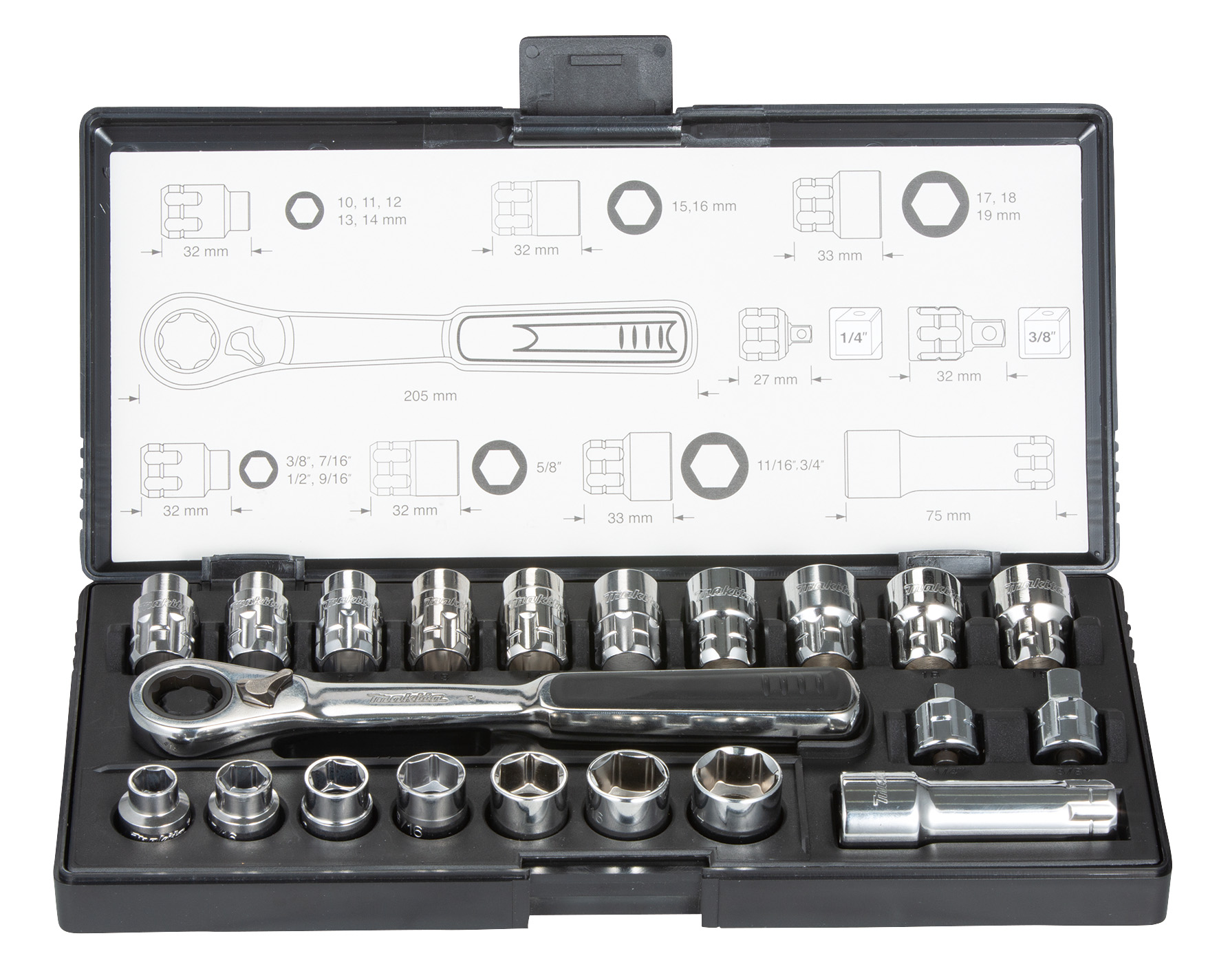 Sada obsahuje ráčnu 205 mm, prodloužení 75 mm, nástrčné hlavice velikosti 10, 11, 12, 13, 14, 15 ,16, 17, 18 a 19 mm, nástrčné hlavice velikosti 3/8", 7/16", 1/2", 9/16", 5"8", 11/16" a 3/4", adaptér 1/4", 27 mm a adaptér 3/8", 32 mm. Ráčna má speciální odlehčené provedení.