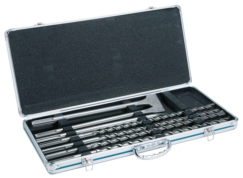 sada sekáčů a vrtáků SDS-Max v Al kufru: vrtáky 18, 20, 22, 25x540mm, špičák + 2x plochý sekáč 25mm