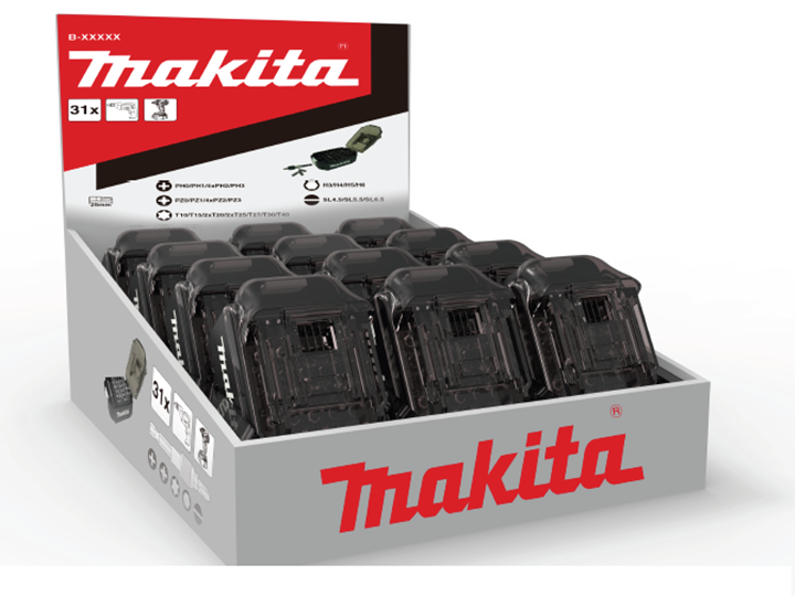 Balení 12 kusů sad bitů, v každé sadě po 31 ks. Každá sada obsahuje bity 25 mm PH0, PH1, 4x PH2, PH3, PZ0, PZ1, 4x PZ2, PZ3, T10, T15, 2x T20, 2x T25, T27, T30 , T40, HEX3, HEX4, HEX5, HEX6, SL 0.6 x 4.5, SL 8 x 5.5, SL 1.2 x 6.5 a držák bitů 60 mm.