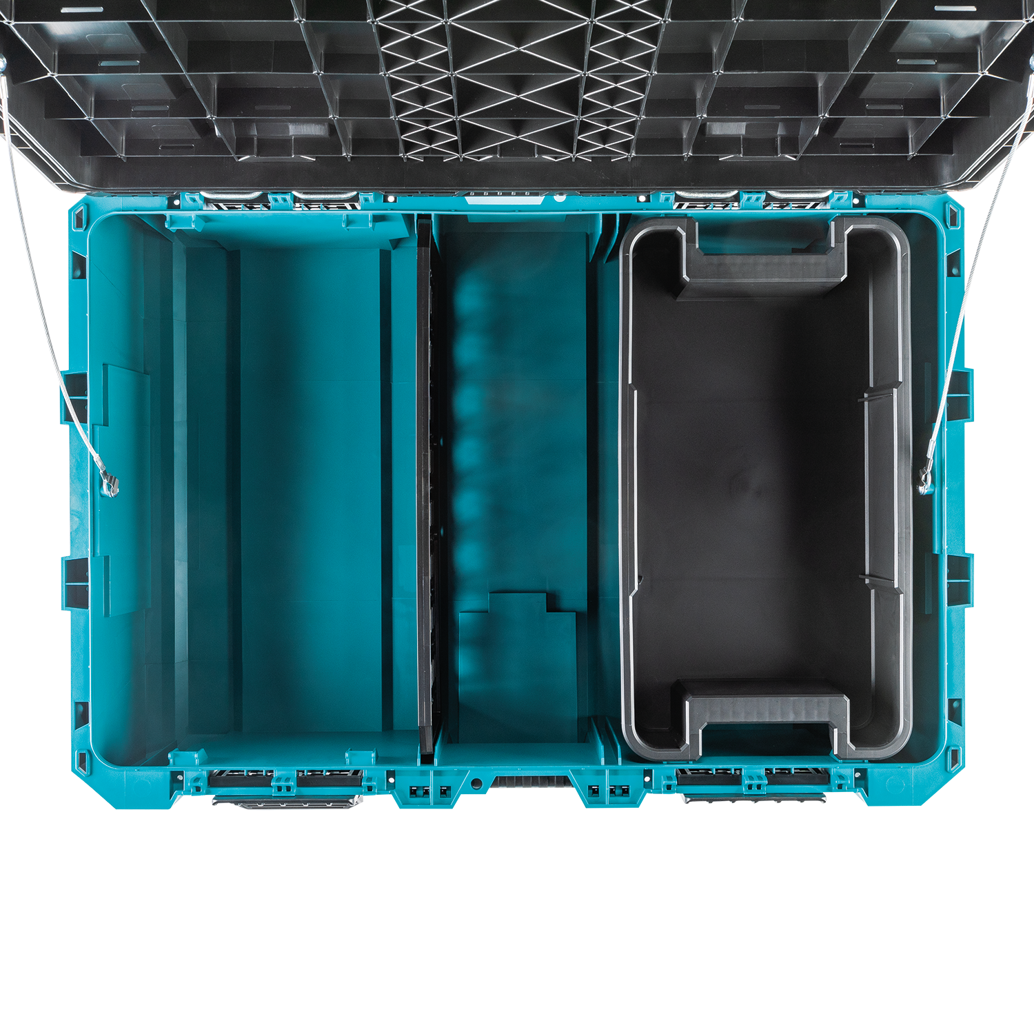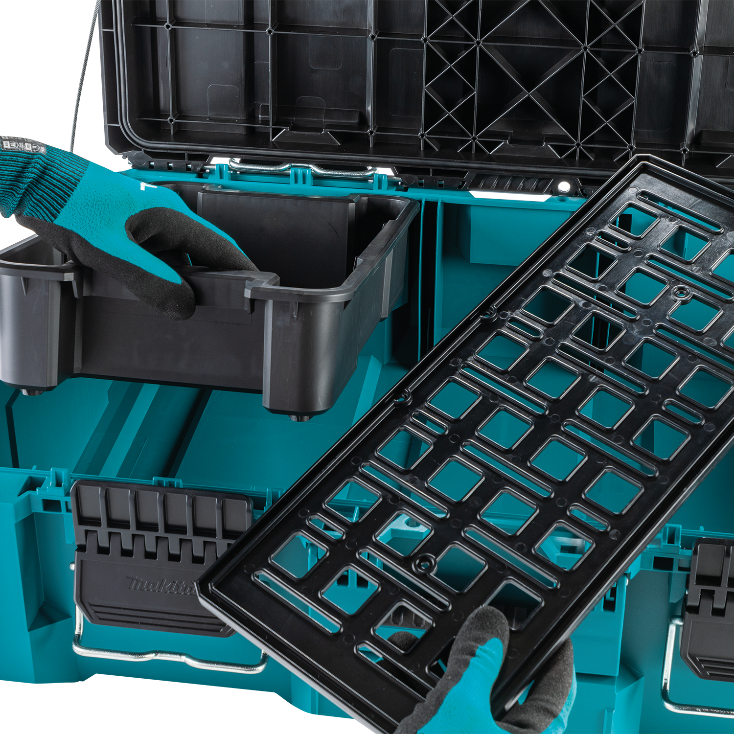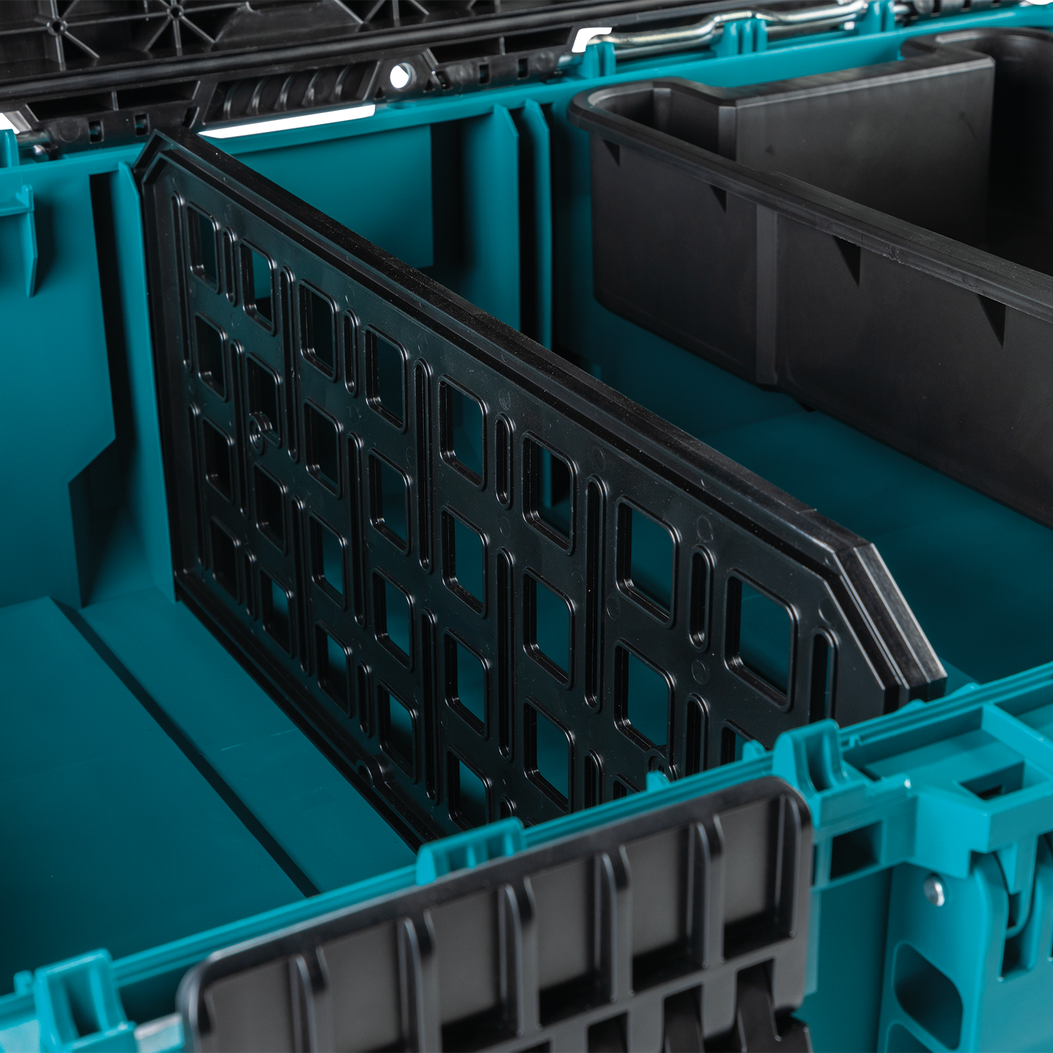 Box na nářadí je vyroben z kopolymeru odolného proti nárazu, aby vydržel nejnáročnější podmínky na pracovišti. Úložný zásobník je navržen jako řešení pro bezdrátové nabíjení s vyhrazeným prostorem pro nabíječku a baterii.