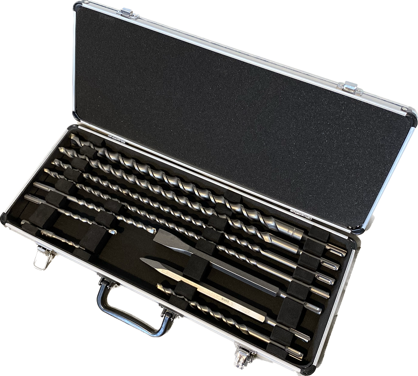 Sada 10 ks vrtáků a sekáčů SDS-Plus v hliníkovém kufru . Vrtáky 6 x 110, 8 x 160, 10 x 210, 12 x 210, 10 x 460, 12 x 460, 16 x 460, 20 x 460, špičák 250 mm a plochý sekáč 20 x 250 mm.