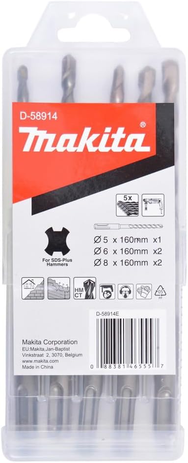 Sada dvoubřitých vrtáků SDS-Plus je dodávaná v plastové krabičce a obsahuje vrtáky 5 x 110 mm, 2 ks 6 x 110 mm a 2 ks 8 x 110 mm.